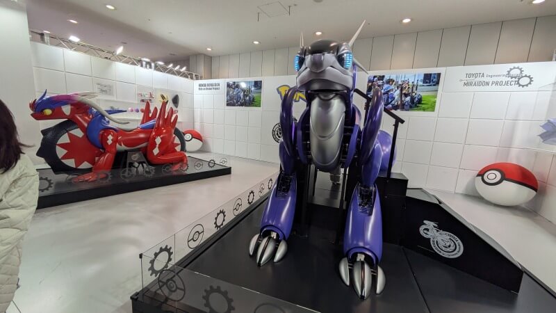 実物大のポケモン「コライドン」(左)と「ミライドン」(右)。コライドンはホンダが、ミライドンはトヨタが作ったというのが面白い。