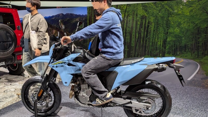 400cc単気筒のオフ車が税込 1,199,000円!という価格が驚きのDR-Z4SM。まあそれだけ自信あり、ということなんでしょうね。(事実、今年の生産分は予約完売とか。) 跨ってみましたが、全く足が届きませんでした。(笑)