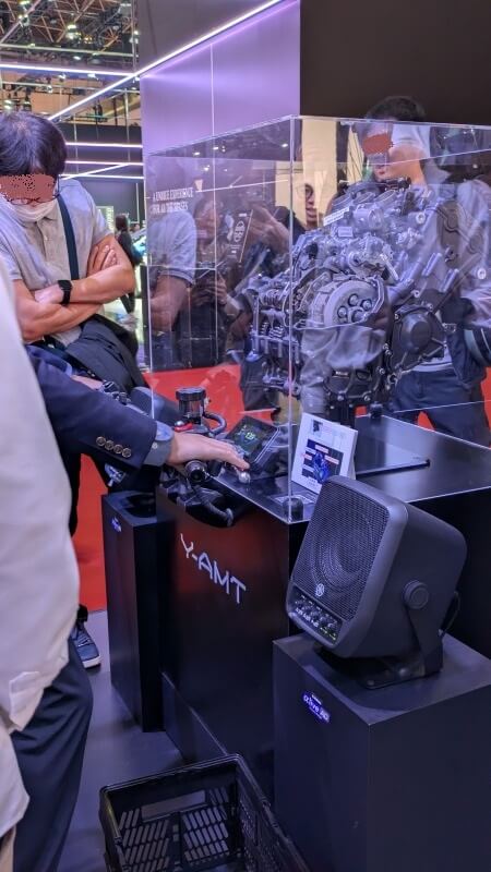 クラッチ操作とシフトペダル操作を不要にする自動変速機構「Y-AMT」のデモ。アクセルに連動してスピーカーから音が出ます。ホンダ E-クラッチへの対抗かもしれないですが、僕としてはE-クラッチの方がシンプルで好き。でもオートマ免許で乗れるようになるのは素晴らしいですね。