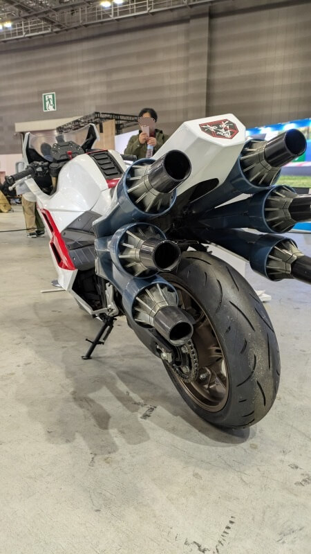 水素エンジンのバイク。パニアバッグのように見えるのは水素タンクでしょうね。
