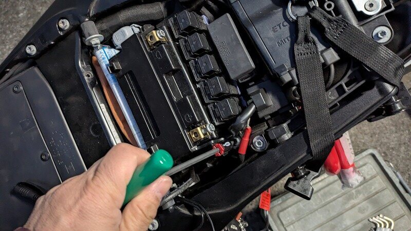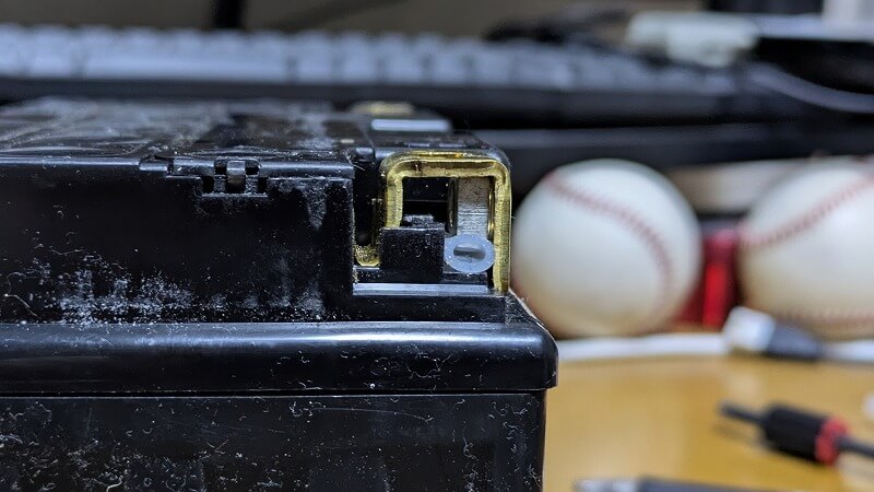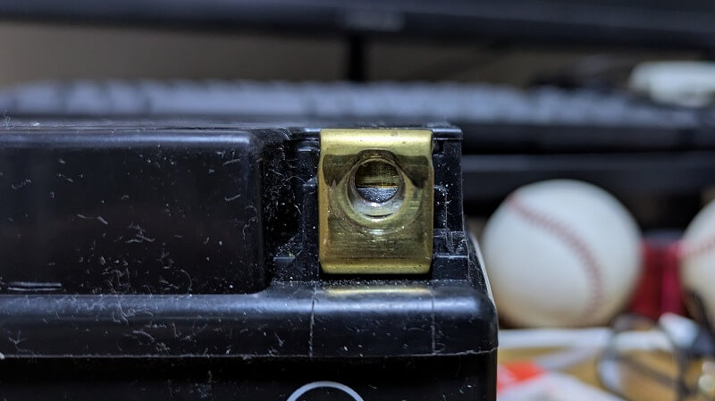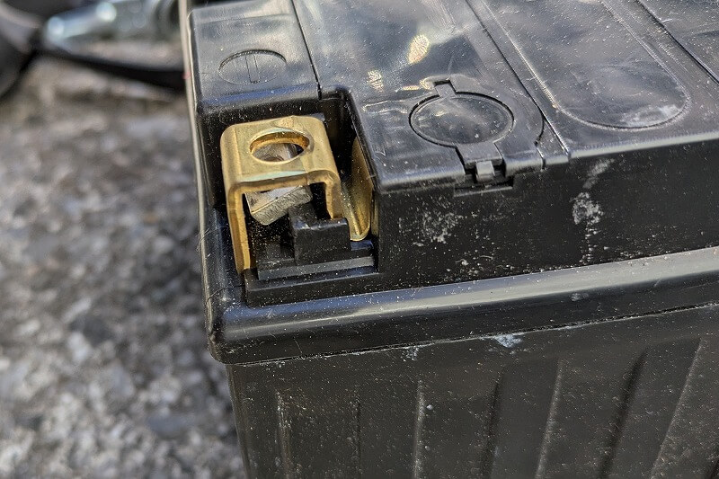 あとはバッテリーを車体に戻すだけなのですが、このバッテリー、端子の中に四角いナット(ターミナルナット/スクエアナット)が入っていて、これが動くのでボルトを締める時にイライイラします。あげく、端子の横からポロっと落ちたりします。