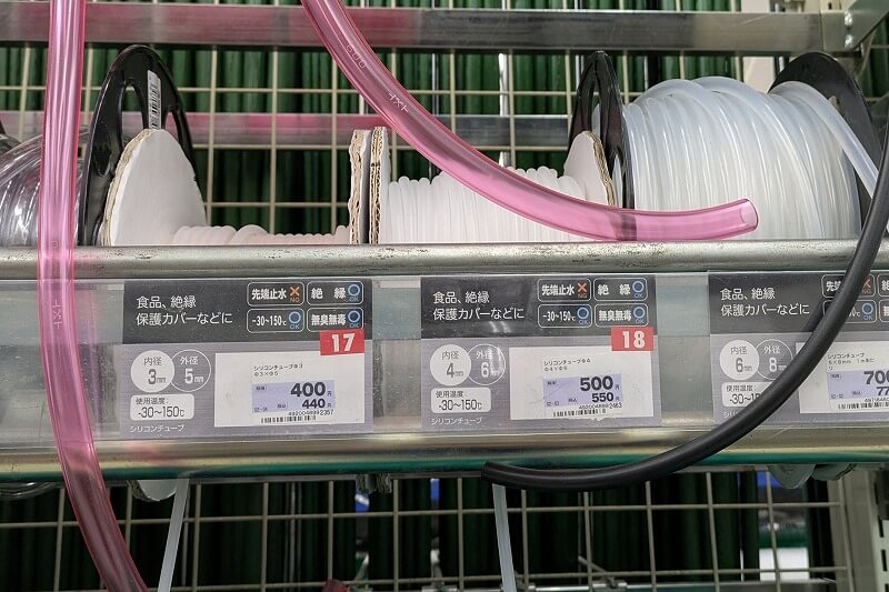 近所のホームセンターにチューブを買いに行きました。今回は外径5mmと6mmのシリコンチューブを買って試してみます。