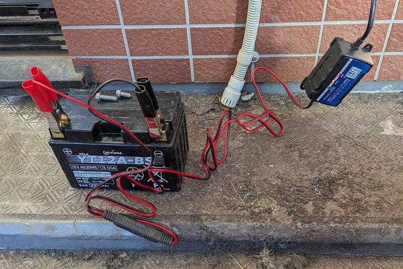 毎度おなじみスーパーナットの充電器で充電します。格安の充電器ですが、トリクル充電にも対応。コスパ抜群です。