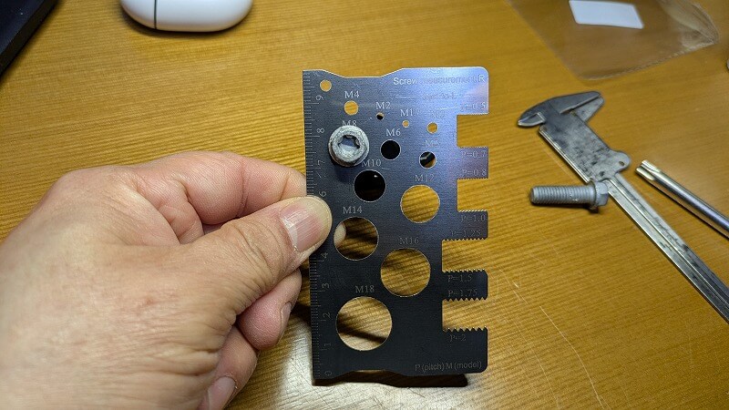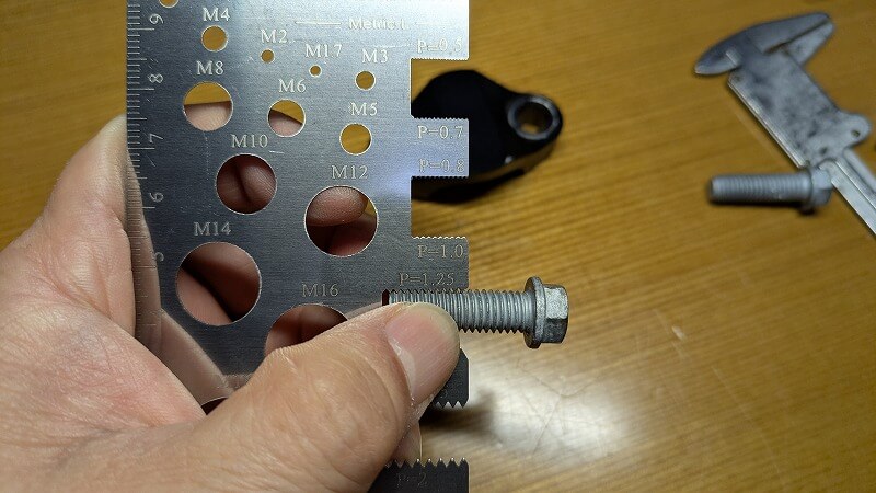 ボルトを測るには、ピッチゲージが必要です。簡単なものでもいいので、1つは持っておきたいところ。(ぼくは今回あわてて買いました。w)