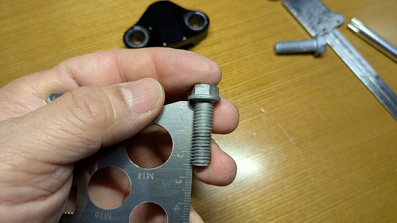 最初、純正同様のフランジボルトを探していたのですが、フランジ部分の径が14mmというのが多いです。たぶん14mmでもいけるとは思うのですが、ひょっとするとクランプ本体に干渉するかもしれません。