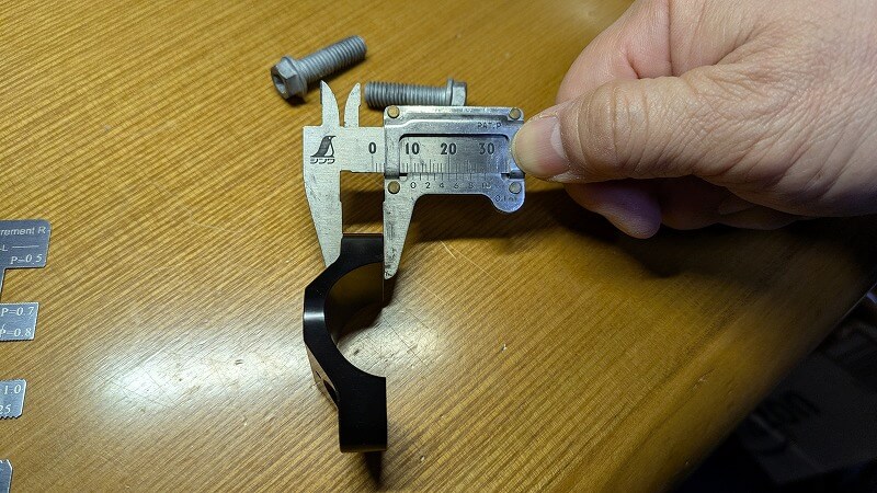ハンドルクランプのネジ穴部分の厚みはおよそ10mm。25mm-10mm=15mmなので、15mm以上はネジ部の長さがないとネジの役割を果たせません。