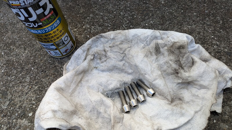 カジリ防止のため、ネジ部にスプレーグリス(二硫化モリブデン)を塗布しました。※チタンは齧りやすい材質ですが、転造でつくられたチタンボルトは、実際にはほとんどカジる心配はないそうです。
