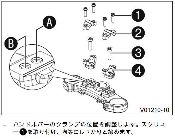 ハンドルクランプの取り付けには、クランプの車体前方のボルトを先ず締め付け、その後、後ろ側のボルトを締め付ける(この場合、クランプの後ろ側には隙間ができる)場合と、前後のクラインプの隙間を均等にして締め付けるタイプとがあります。