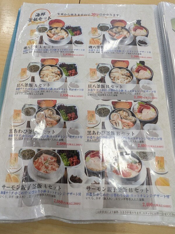 ノーマークだったのがこのページ。海鮮の釜めし!注文してから30分位かかるみたいですが、これは美味しそう!次回はこれを食べに来ようかな。