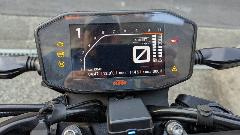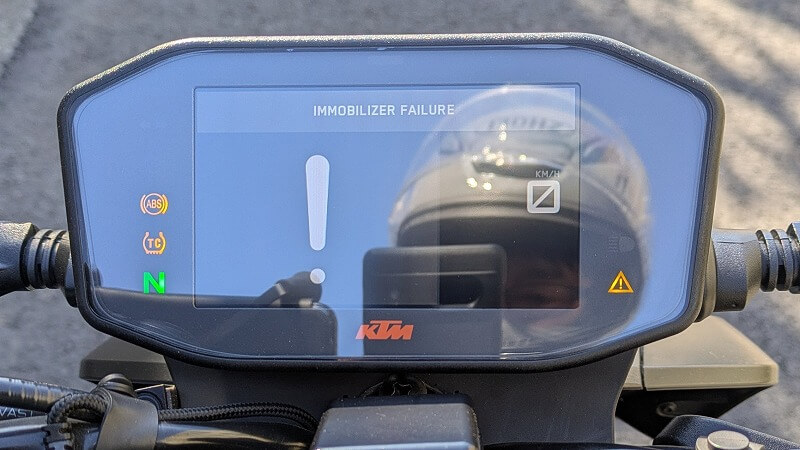 ずっと下道を走っていたのですが、途中信号でギアを落とすのを忘れ、うっかり3速発進してしまったところあえなくエンスト。恥ずかしー!と急いでセルを回してエンジンをかけたのですが、出ました!またしても「イモビライザーエラー」の警告表示です。(オレのDUKEにイモビライザーなんて着いてないってば・・・)