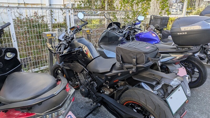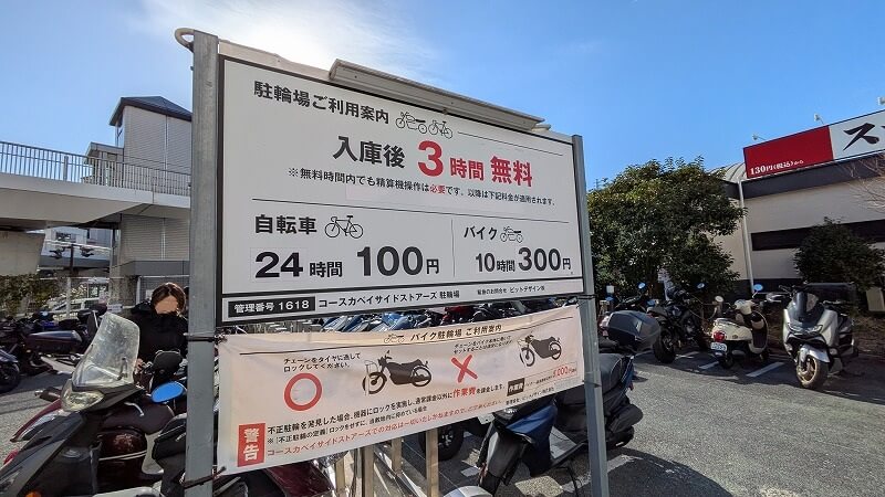 近くのバイク置き場はなんと3時間無料。