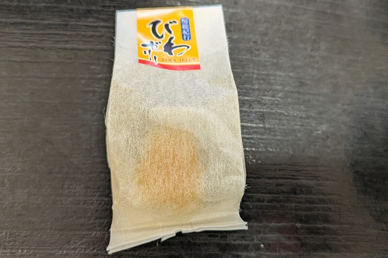デザートにびわゼリーが付いています。このなかに固まったゼリーが一粒入っているんだと思ったら、固まっていないゼリーが出てきて飛び散らかしそうになりました。味はさわやかで美味しかったです。