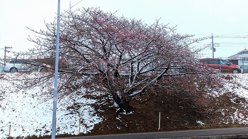 うちの近所にポツンと一本だけ立っている河津桜。ちょっと芽吹き始めているのですが、今日は雪化粧でした。