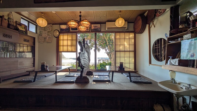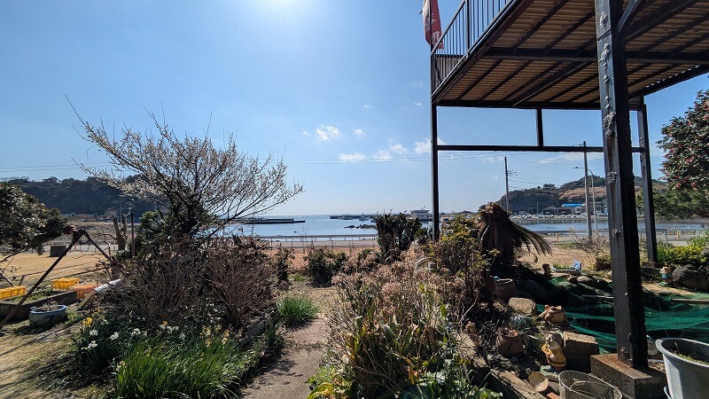 店の前に広がる海は毘沙門湾。車通りも少なく、のどかな風景が広がります。