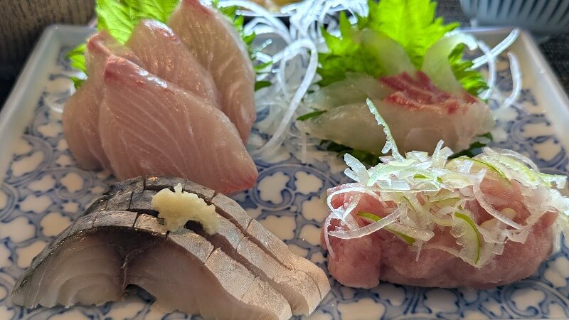 この日の刺身はマダイ、ブリ、しめさば、ネギトロ