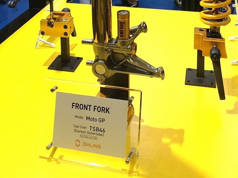 MOTO GPマシン用の倒立フロントフォーク。アウターチューブはカーボンです。ただ、三又でクランプされるところは金属製(多分アルミ)のアウターが被せられた二重構造になっています。