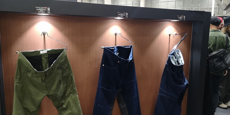 これはチノパンですが、ヒザにパッドが入っていたり、ポケットにファスナーがついていたり、股の部分は二重に補強されているなど、バイク仕様になっています。