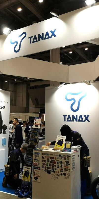 毎年何かしら新しい発見がある、バイク用品メーカータナックスさんのブース。