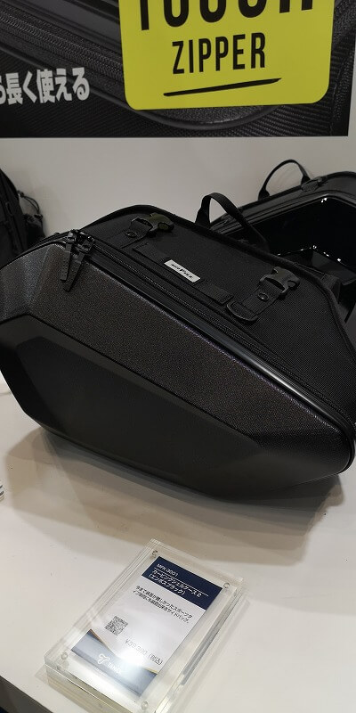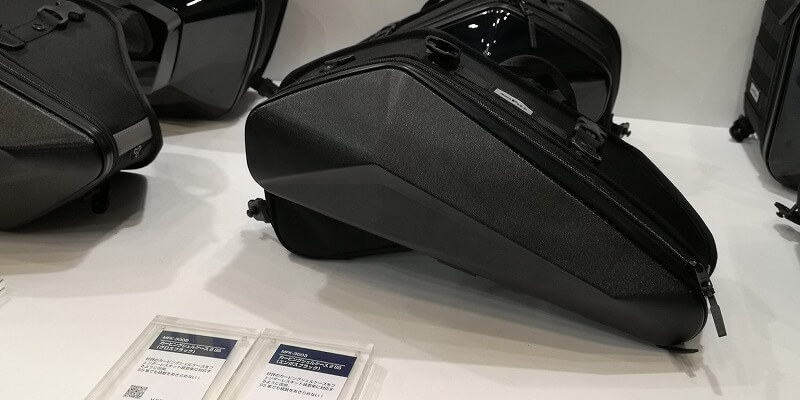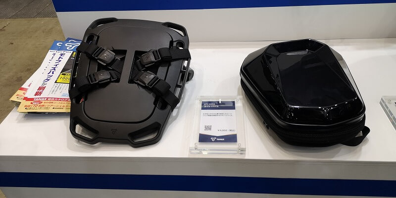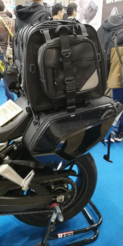 左側になるのは「ライザーベース」。小さなリアシートしかないSS車などでも、これを装着することで大きなシートバッグを安定して積載できる、という優れもの。去年はすごく推してたんだけど、今年はひっそり展示。