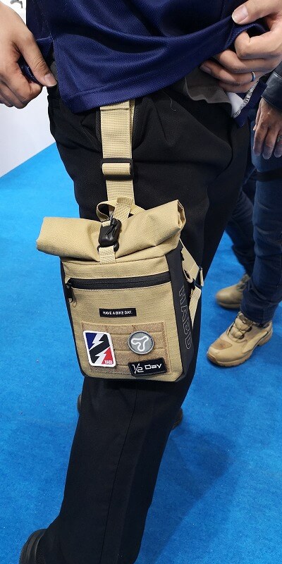 こんな風にベルトから吊り下げて太ももに固定するそうです。開口部がロールになっていて、結構容量があるとのこと。