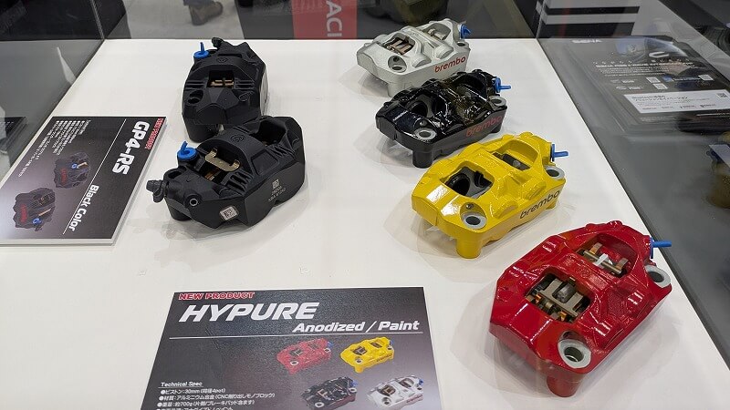 アルマイトやペイントで鮮やかな入りになったキャリパー。赤とか黄色って四輪車では見かけるけど、バイクでは見ないですよね。個人的好みだとやっぱりブラックがポリッシュですねえ。