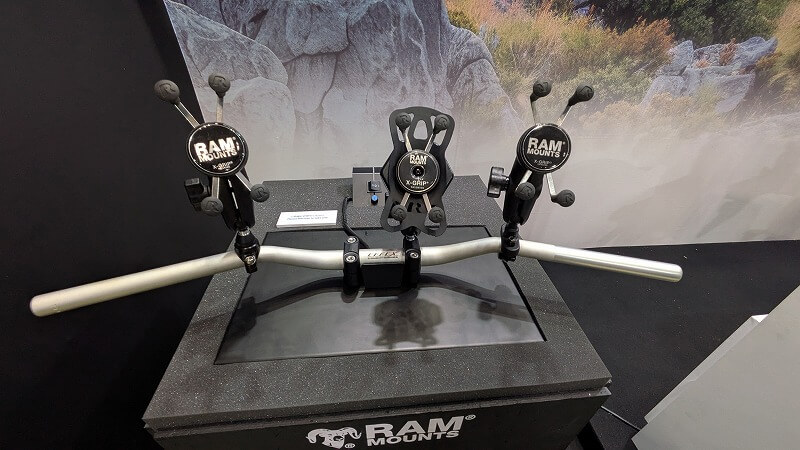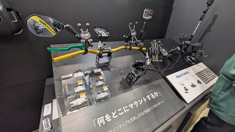 こちらは僕も愛用しています。スマホホルダーの「RAMマウント」のコーナー。スマホケースを自由に選べる点が非常に便利。