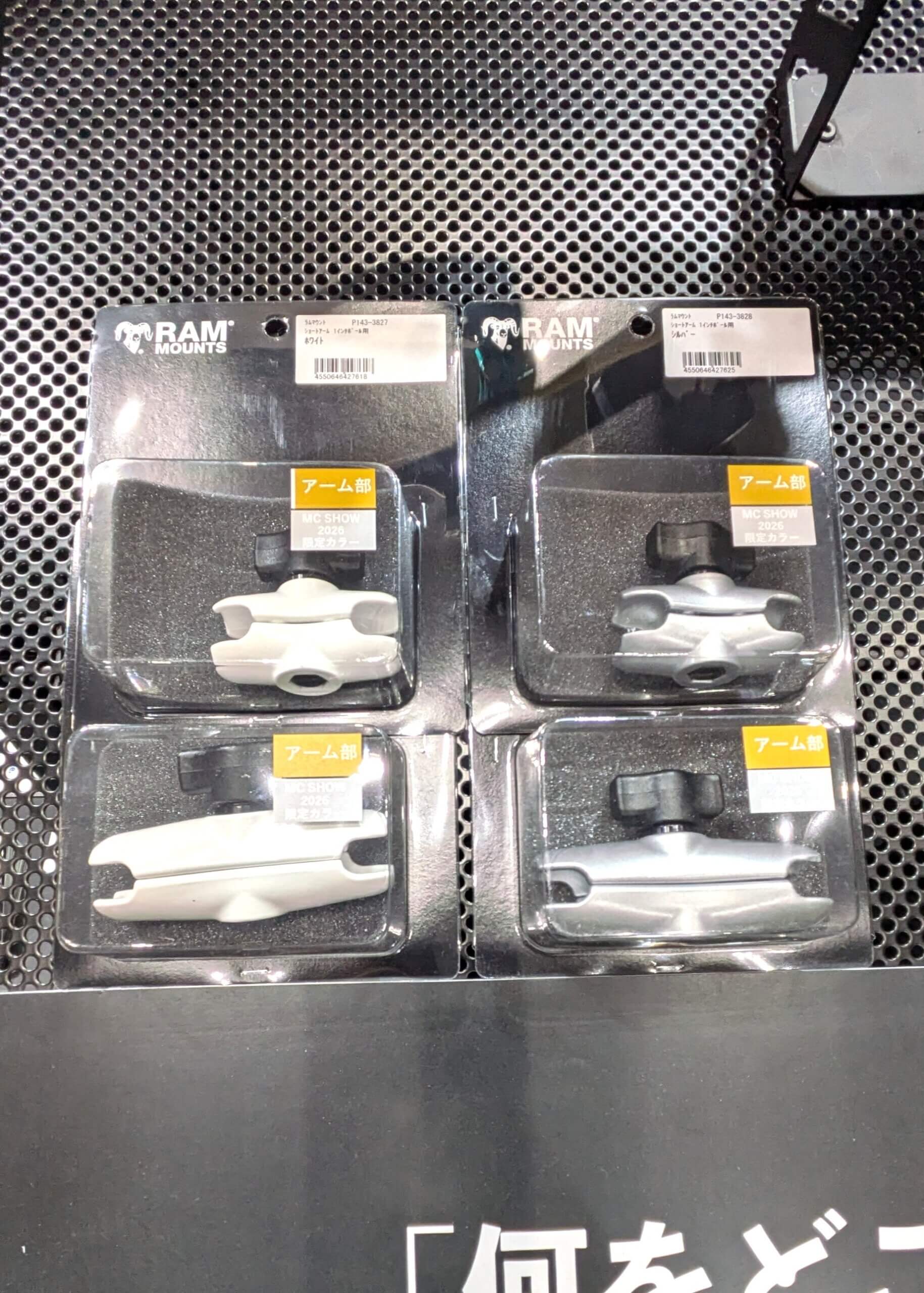 そのRAMマウントに使うジョイントアーム。通常はブラックのみの1色となりますが、この日、東京モーターサイクルショー特別企画として、この会場でのみ買えるシルバー塗装Ver.とホワイトという特別なパーツです。