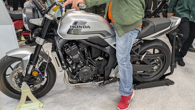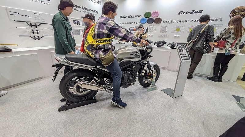リアタイヤの後ろにある黒いバーが見えるでしょうか?あのバーを床面へ倒すと、リアタイヤ下のジャッキが上がって、車高が20mm持ち上がる仕組み。つまり、持ち上げた状態がCB1000Fのノーマル車高、降ろすとローダウンキットで20mm下がった状態が体感できる、という仕掛けです。