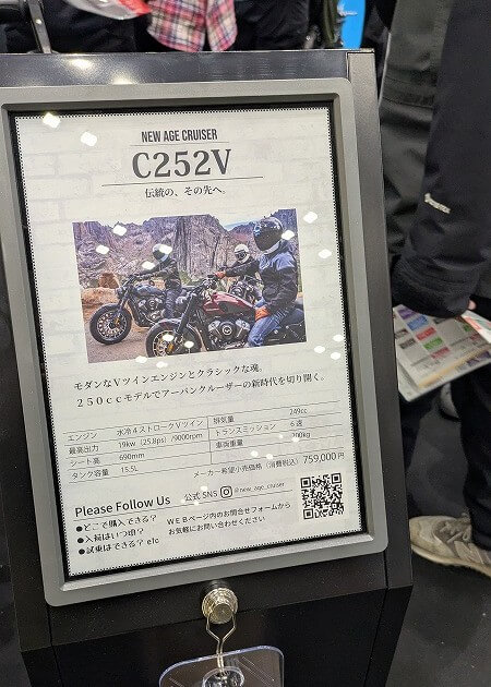 まずは Morbidelli(モルビデリ)「C252V」。水冷V型2気筒 249cc。ハーレーのNightsterに非常によく似ていて、とても250ccには見えません。